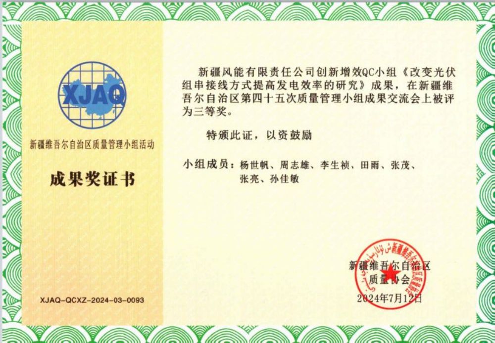此次交流會風能公司提交了三項Q C課題成果,與來自全疆各地的289個優(yōu)秀項目同臺競技。歷經(jīng)專家評審團的嚴格考察與綜合評定,最終,公司榮獲“表現(xiàn)突出集體”的稱號。其中“改變光伏組串接線方式提高發(fā)電效率的研究”項目喜獲三等獎,成為公司質量管理與技術創(chuàng)新征程上一座新的里程碑。